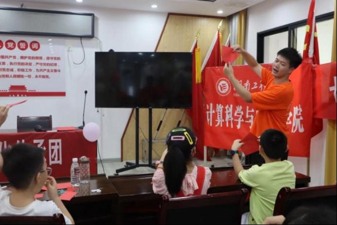 红心逐梦行,剪纸颂党情。“小朋友们,大家知道传统剪纸艺术是起源于什么时候吗?”实践团成员介绍了剪纸历史、剪纸文化、艺术特征,详细地讲解了剪纸的步骤,耐心地指导小朋友们折纸、画图、剪裁……小朋友们发挥自己的想象力,用小小的剪刀在薄薄的红纸上裁剪出自己的作品。通过亲自动手实践,增强了小朋友们对传统文化的认同感和自豪感。