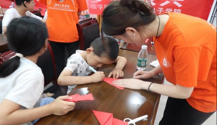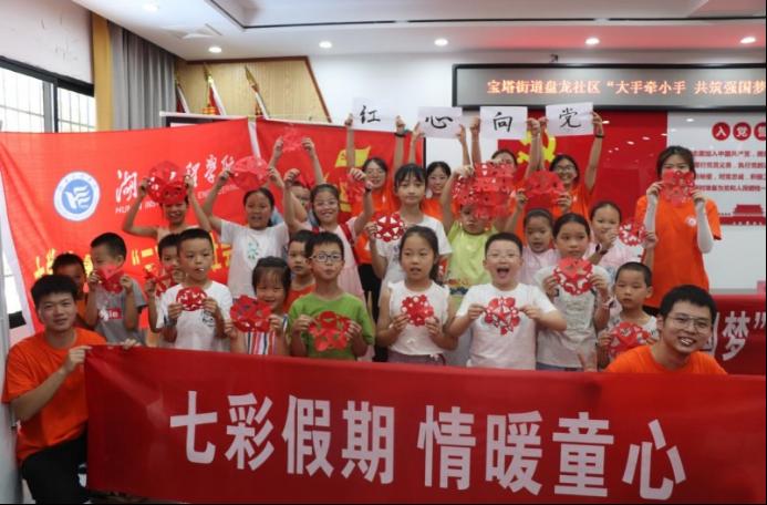 暑期三下乡“大手牵小手 共筑强国梦”中华文化传承团共25名师生在湘潭市岳塘区盘龙社区开展传统文化教育实践活动,精心设计课程内容,将剪纸、毛笔字这两项具有中华传统文化的艺术形式带入到课堂。