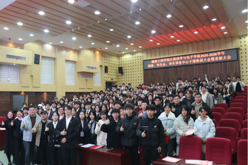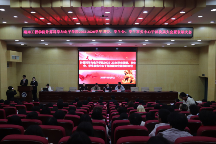 12月17日晚,在主校区二报告厅,学院隆重召开2025-2026学年学生干部换届大会暨表彰大会。学院学生办公室主任李进、辅导员徐文娟、杨俐、周晓雨、23级团学会干部及新任团学会干部干事、2025-2026年朋辈辅导员等共200余人参加会议,共同见证责任交接与荣誉时刻。大会由谭程文和朱梦如主持。